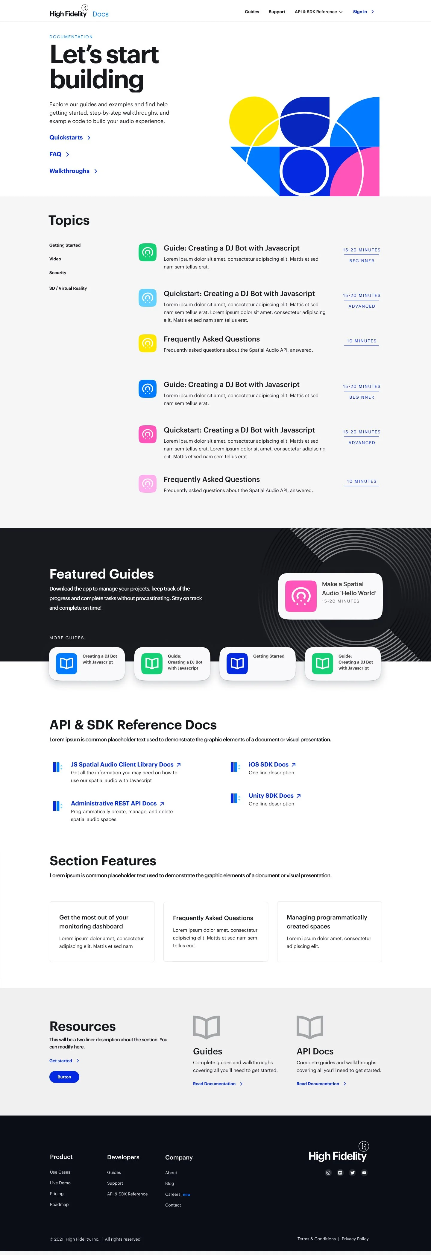 High Fidelity had developed a proprietary library and API to enable app developers to integrate it’s state of the art real-time spatial audio processing into their products. To support development and sales, we needed to build a website that simultaneously communicated the impact and value of spatial audio (which was not widely understood in 2019,) and needed to provide the documentation necessary to guide developers in the process of integrating the libraries.